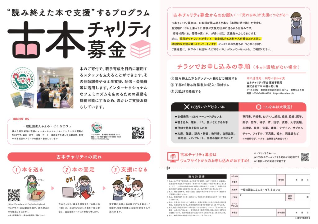 読み終えた本を「本棚お助け隊」にお送りいただくと、本の査定が行われ、その査定額に10%を上乗せした金額が、ふぇみ・ゼミ&カフェへ寄付されます。ご自宅の本棚に眠っている本が、インターセクショナル・フェミニズム運動を支える力になります。
